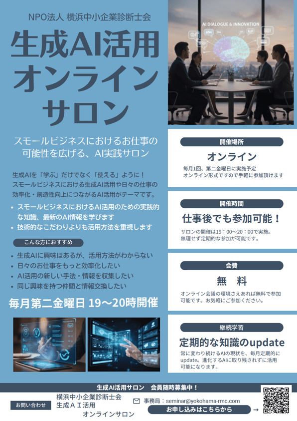 スモールビジネスにおける仕事の可能性を広げる、AI実践オンラインサロンを毎月第2金曜日19時~開催しています。