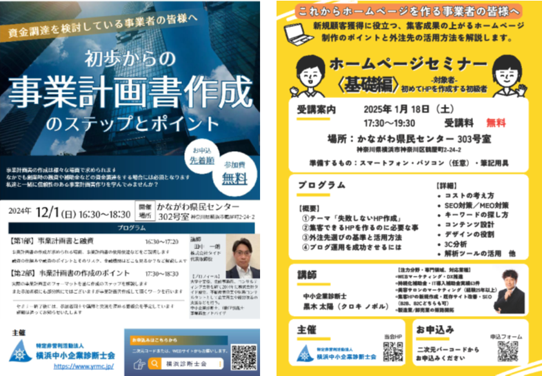 横浜中小企業診断士会では、経営者の皆さまの実務力向上を目的とした無料セミナーを開催しています。ホームページ制作や集客の基本、SEO・AIを活用したデジタルマーケティング、事業計画書の考え方など、すぐに役立つテーマを中心にわかりやすく解説します。専門家が実例を交えながら丁寧にお伝えするため、「基礎から学びたい」「新しい施策を考えたい」「事業を整理したい」といった方にも最適です。