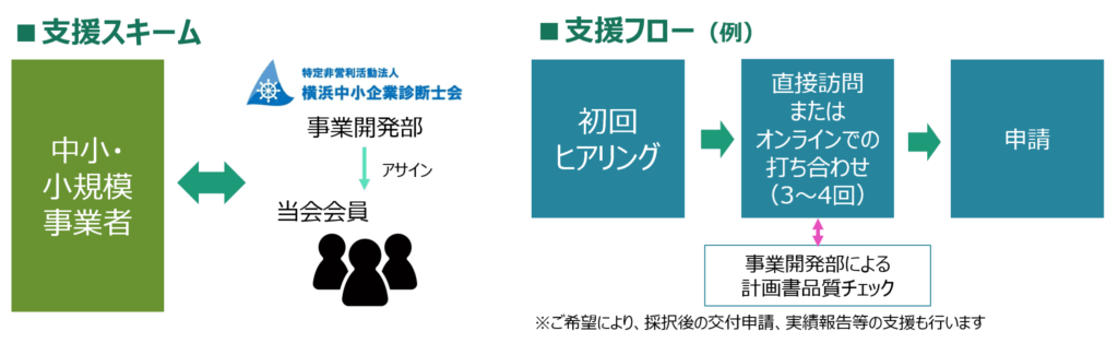 当会では、中小・小規模事業者の資金調達をサポートするために、補助金支援プロジェクトを発足し、国や神奈川県、横浜市などの各種補助金についての申請支援活動を行っております。